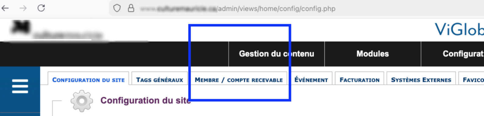 Menu : Configuration → Configuration du site → Membres / Comptes recevables.