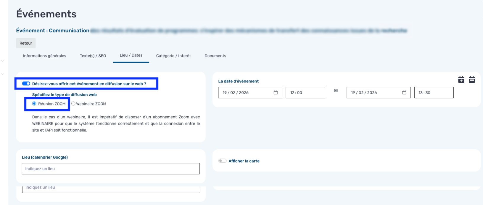 - Activez l’option de webdiffusion (Zoom) dès la création de l’événement.