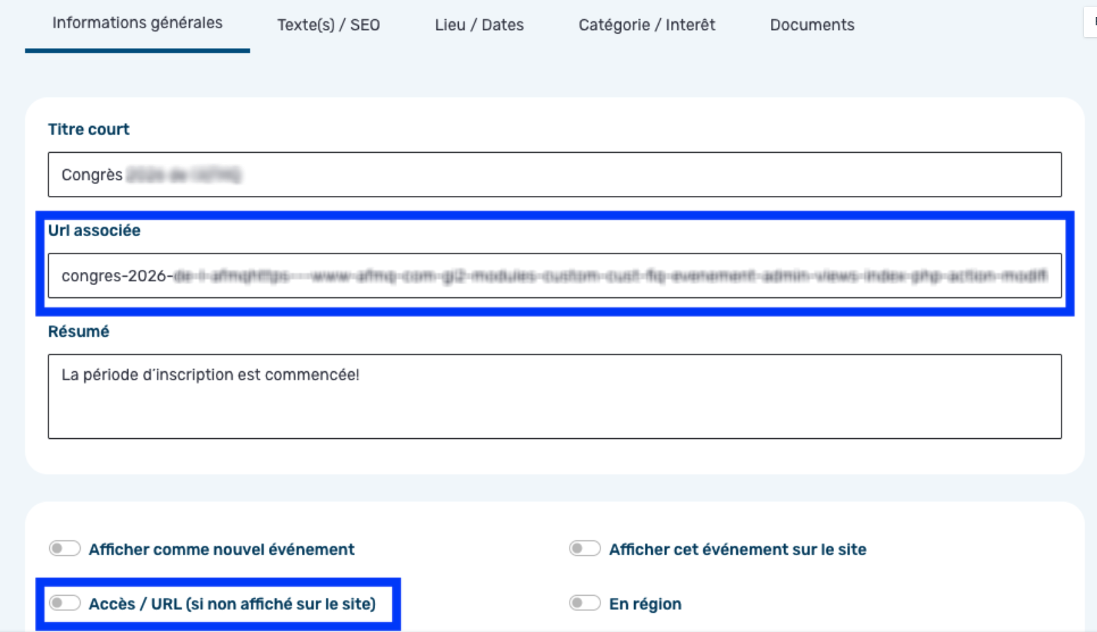 - Réactivez l’événement si nécessaire avec l'option Accès / URL (si non affiché sur le site)