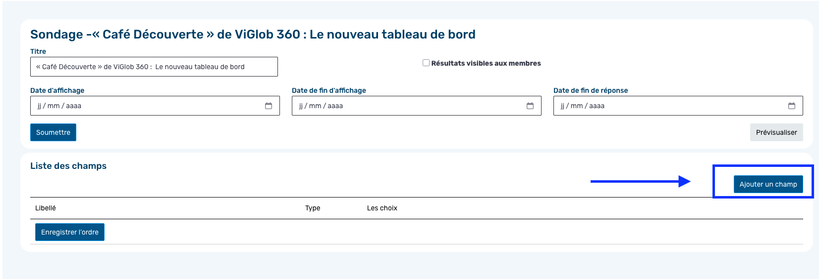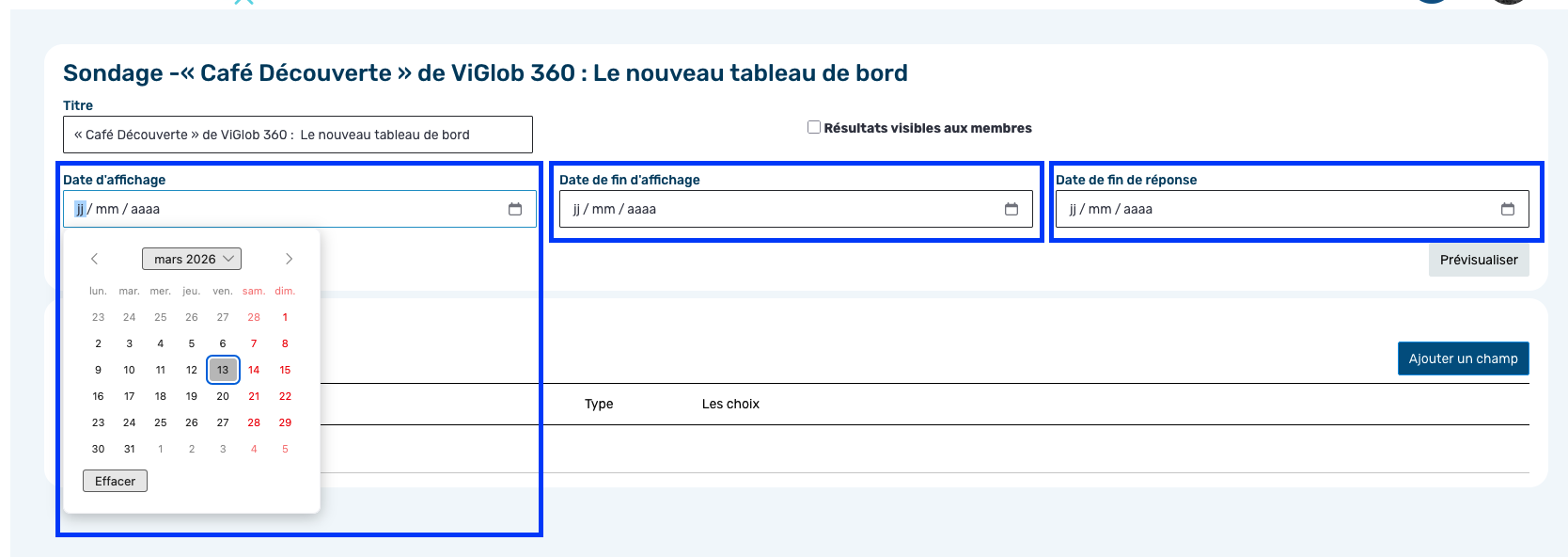 Définissez la date de début d’affichage du sondage dans la zone membre des participants.