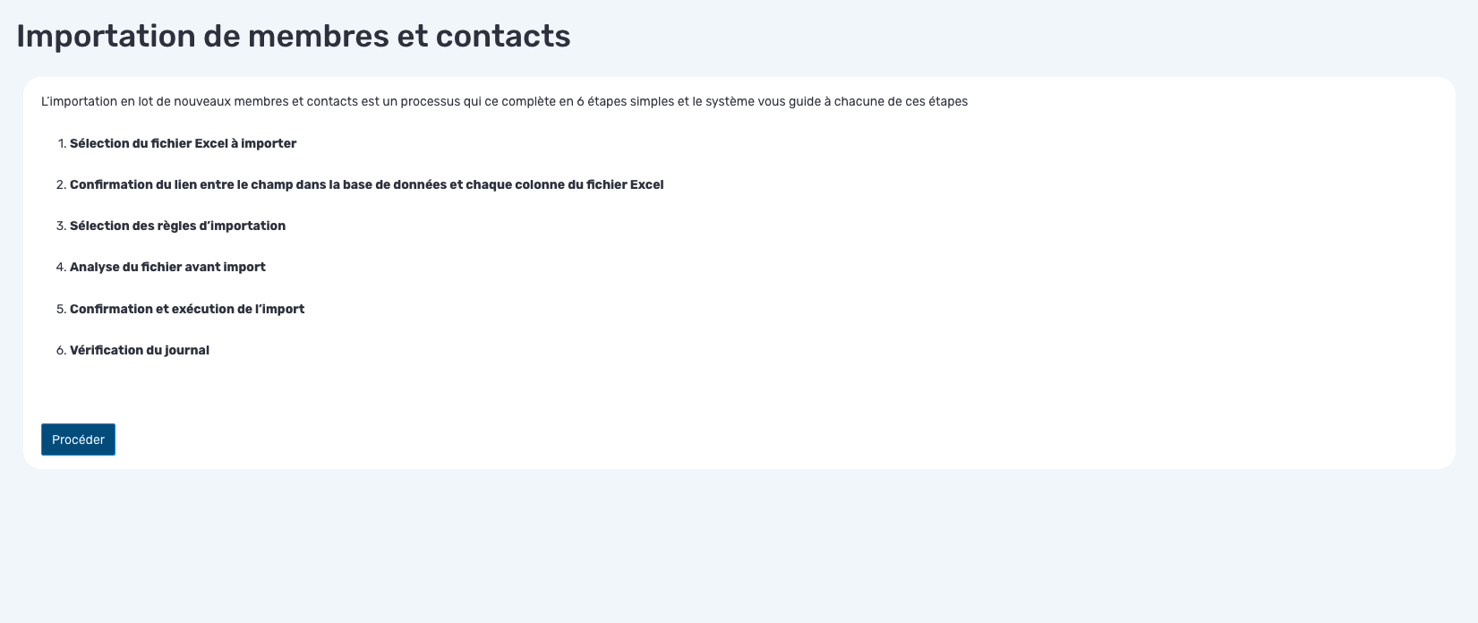 L’importation en lot de nouveaux membres et contacts est un processus qui ce complète en 6 étapes simples et le système vous guide à chacune de ces étapes.