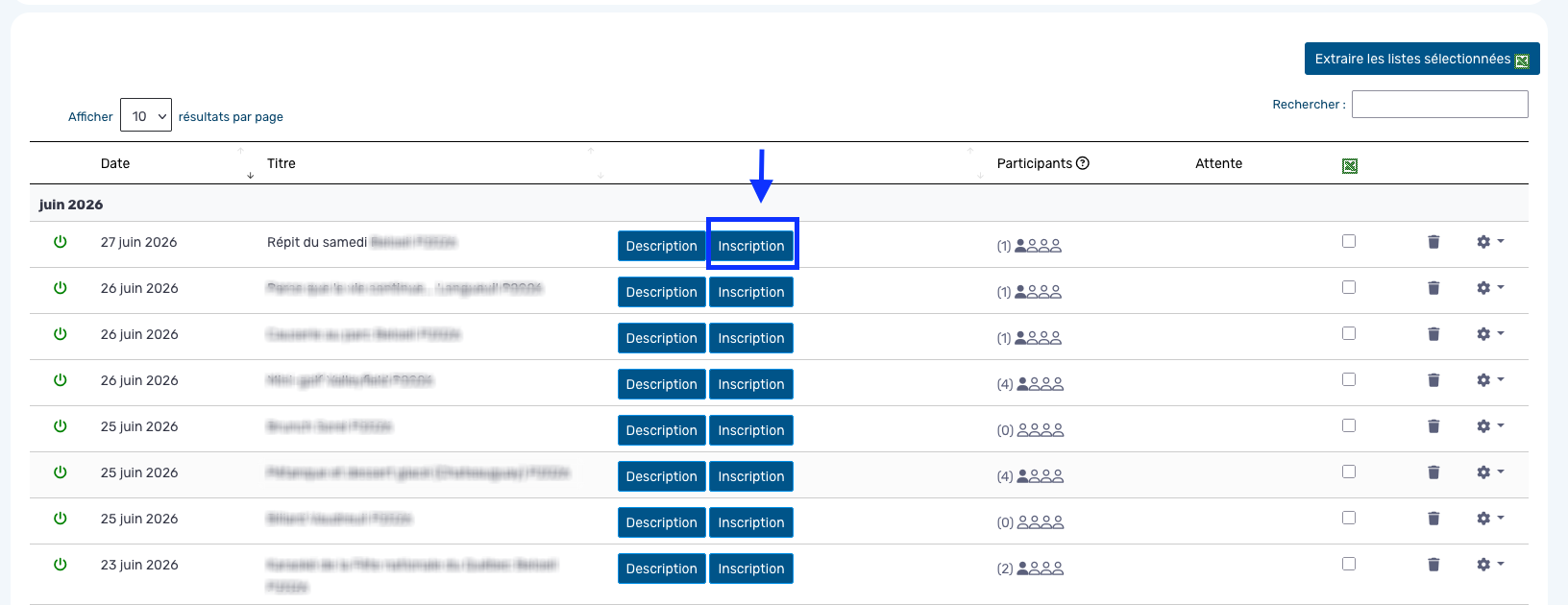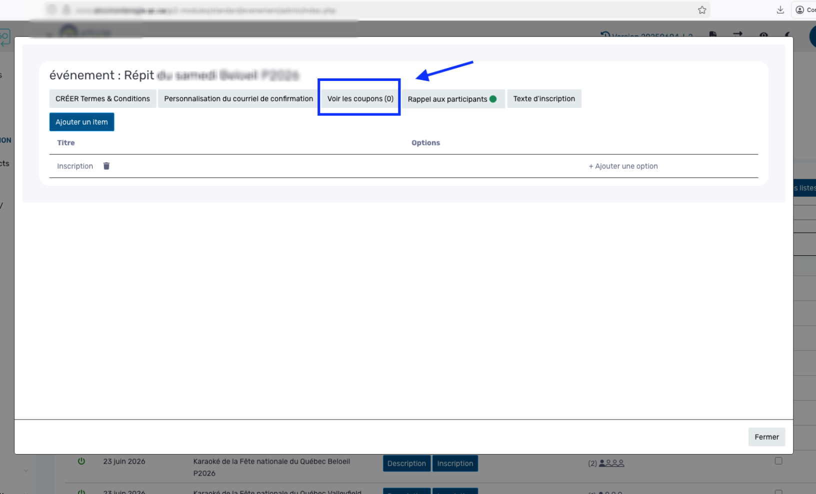 - Accédez à votre module « Événements » et repérez l’événement pour lequel vous souhaitez ajouter un rabais (en argent ou en pourcentage).