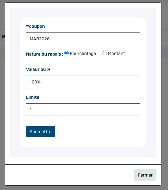 Sur la plateforme ViGlob, vous avez la possibilité de créer des coupons de rabais afin d’offrir des réductions à vos participants. Vous pouvez choisir entre un montant fixe ou un pourcentage, selon vos besoins.